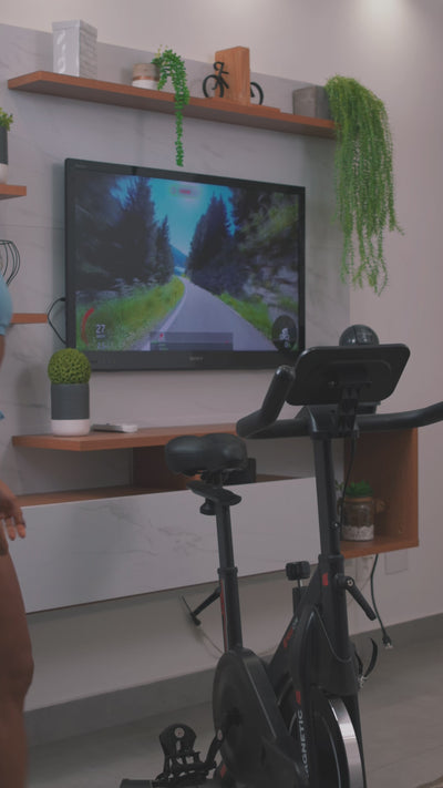 Sim, a conexão se dá través dos Aplicativos Kinomap, Zwift ou My Woosh. Você instala e faz login no seu App preferido em seu smartphone ou tablet, em seguida, realiza o pareamento da Smart Bike. Agora sua Bike já está conectada. Após isso, espelhe a tela do Smartphone/Tablet em uma TV e pronto. Atenção em relação a compatibilidade do modelo de smartphone com sua TV. O procedimento de espelhamento de tela varia conforme a marca.