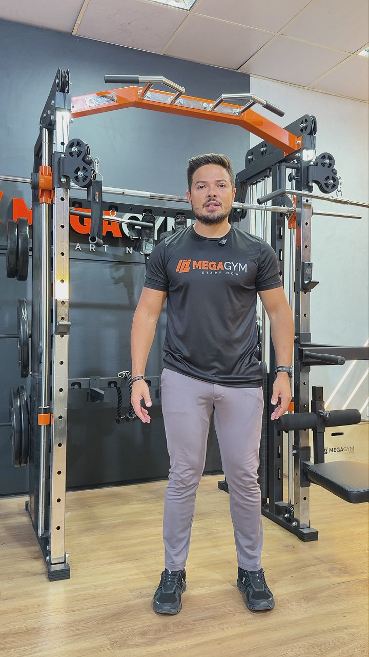 O MULTI CROSSOVER SMITH MegaGym, agora conta com Smith (Barra guiada), utiliza uma barra fixa em trilhos verticais cromados, permitindo movimentos lineares e seguros, ideal em treinos de isolamento, elimina a necessidade de estabilização, focando intensamente na contração muscular (quadríceps e glúteos). Oferece maior segurança com travas automáticas, sendo excelente para altas cargas, do iniciante ao profissional.